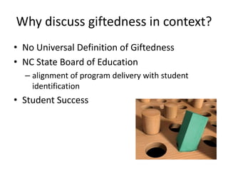 This document discusses understanding giftedness and identifying gifted students. It begins by outlining the goals of understanding unique gifted behaviors, providing resources for talent development, and identifying students using a 6-step strategy. It then provides examples of matching personality descriptions with famous individuals. The rest of the document discusses defining giftedness, characteristics of gifted individuals such as asynchronous development and underachievement, looking for advanced abilities, and differentiating gifted learners from high achievers. It aims to help understand giftedness in context and identify gifted students.