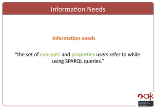 The document discusses identifying information needs by modeling collective query patterns. It analyzes logs of SPARQL queries to determine the concepts and properties users refer to, representing their information needs. Understanding information needs is important for semantic search success. The authors aim to formalize and analyze query logs to identify and consume information needs, gaining better insight into data usage. The outline presents their approach and a dataset used to validate findings.