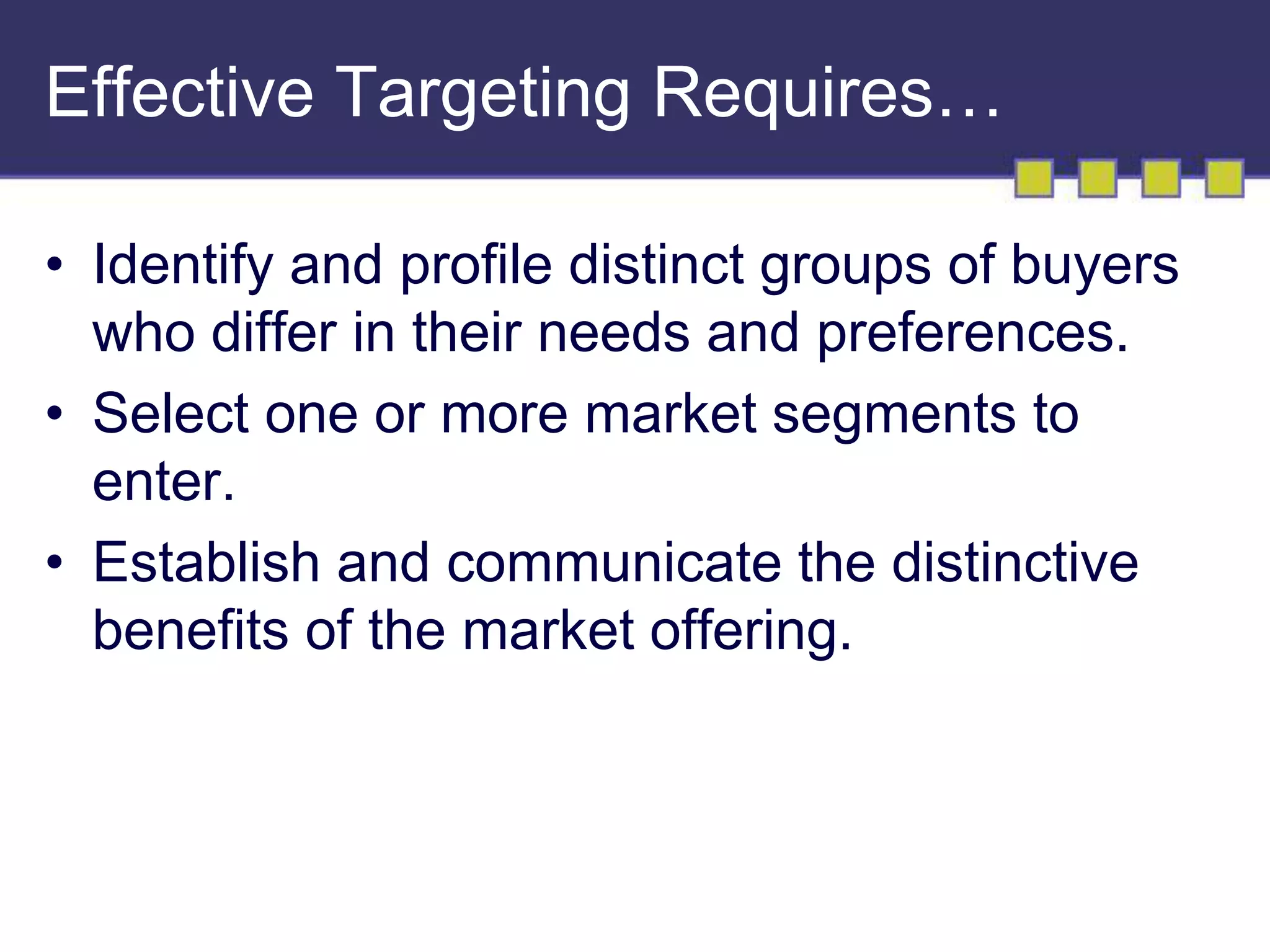 The document discusses market segmentation, targeting, and positioning. It describes identifying distinct customer groups based on needs and selecting target segments. There are several bases for segmenting consumer and business markets such as demographics, behaviors, and firmographics. Effective segmentation results in segments that are measurable, accessible, substantial, and responsive to different marketing strategies. Companies evaluate segment attractiveness based on size, growth, industry forces, and their objectives and resources to determine which target segments to enter.