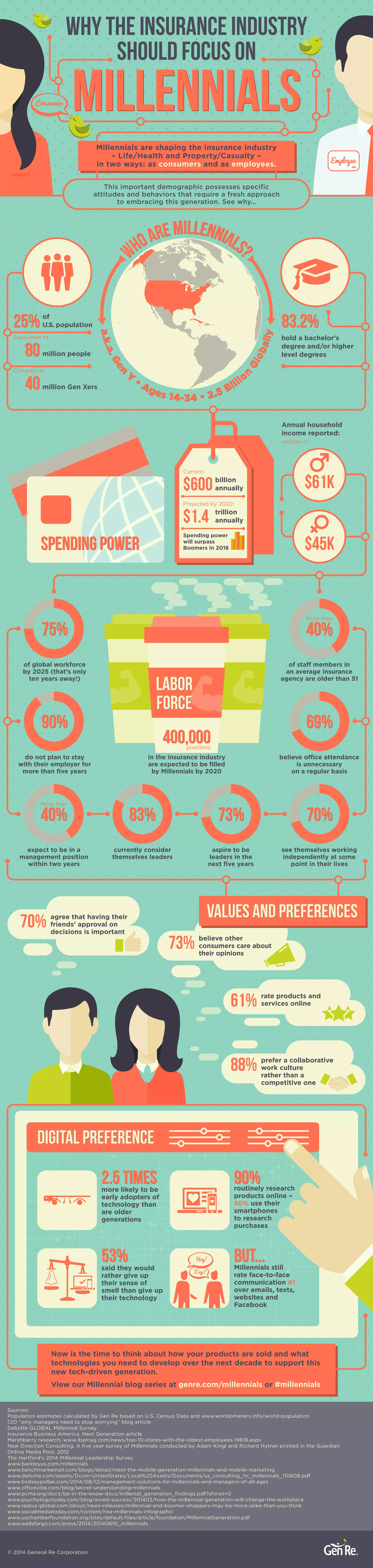 Millennials, aged 14-34, are influencing the insurance industry as both consumers and employees, with a projected spending power that will surpass boomers. This demographic prefers technology and digital solutions but values face-to-face communication, while also seeking collaborative work environments. By 2020, millennials are expected to fill over 40% of positions in the insurance industry, necessitating a shift in how products are marketed and workplaces are structured.