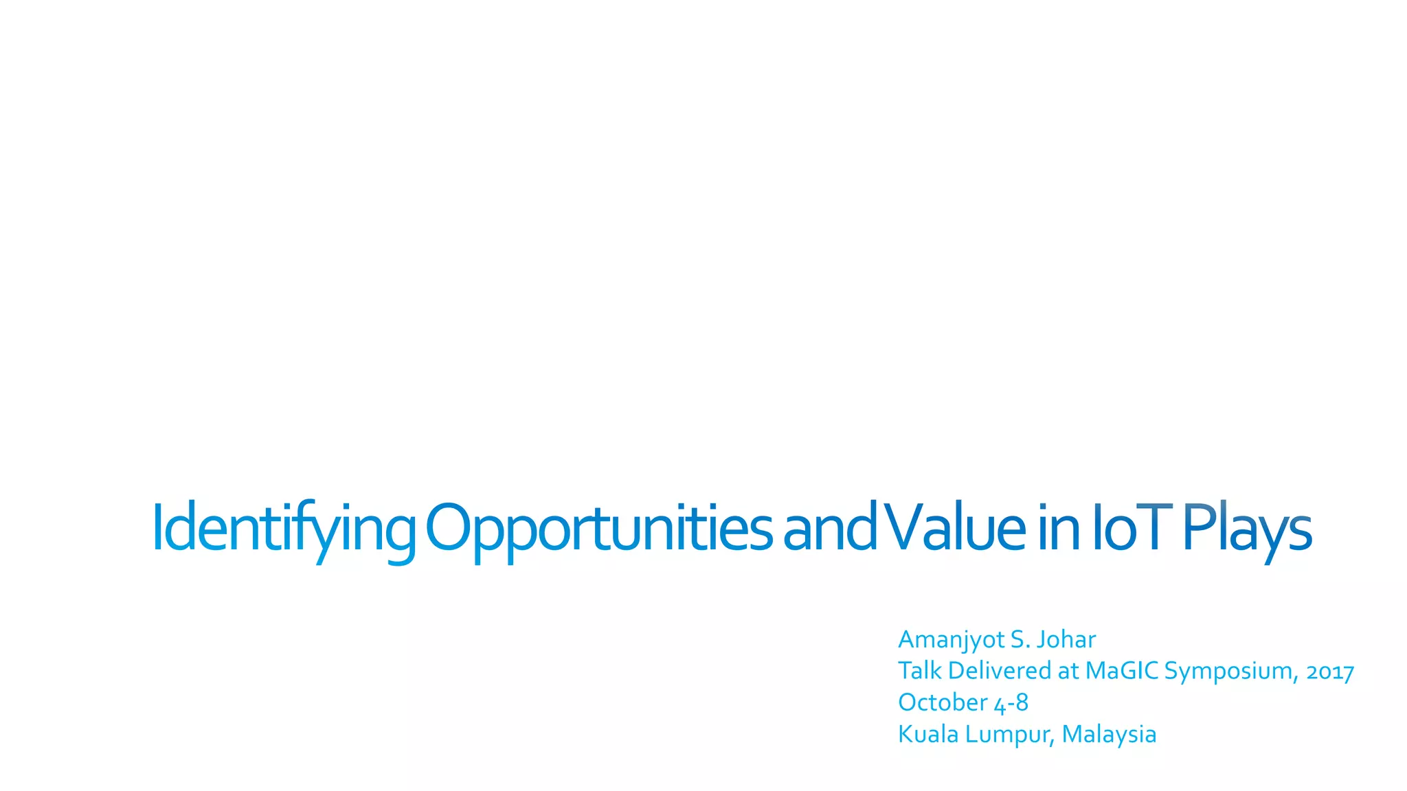 Amanjyot S. Johar's talk at the 2017 magic symposium discusses the rapid increase in connected devices, with predictions of 1 trillion devices within 20 years, emphasizing the importance of data intelligence and the need for advanced technologies like AI to manage this complexity. Key topics include the Internet of Things (IoT) across various sectors, the challenges of connectivity, power, sensing, application enablement, and security, along with examples of innovative IoT solutions. The talk underscores the necessity for tailored designs to address diverse user needs while maximizing the value across the IoT ecosystem.