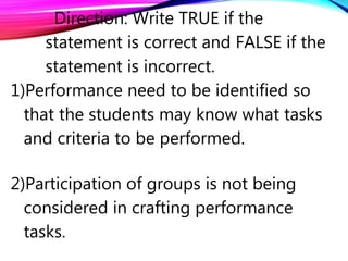This document discusses considerations for developing effective performance-based assessments. It addresses identifying learning targets to assess, constructing clear task descriptions, and suggestions for developing high-quality tasks and rubrics. Specifically: