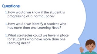 The document discusses strategies for identifying and addressing the educational needs of students with diverse learning backgrounds. It includes case studies of three students with varying levels of academic progress and engagement, highlighting the importance of tracking and monitoring their development. Key themes include the need for personalized support, collaboration among educators, and addressing both language and special educational needs.