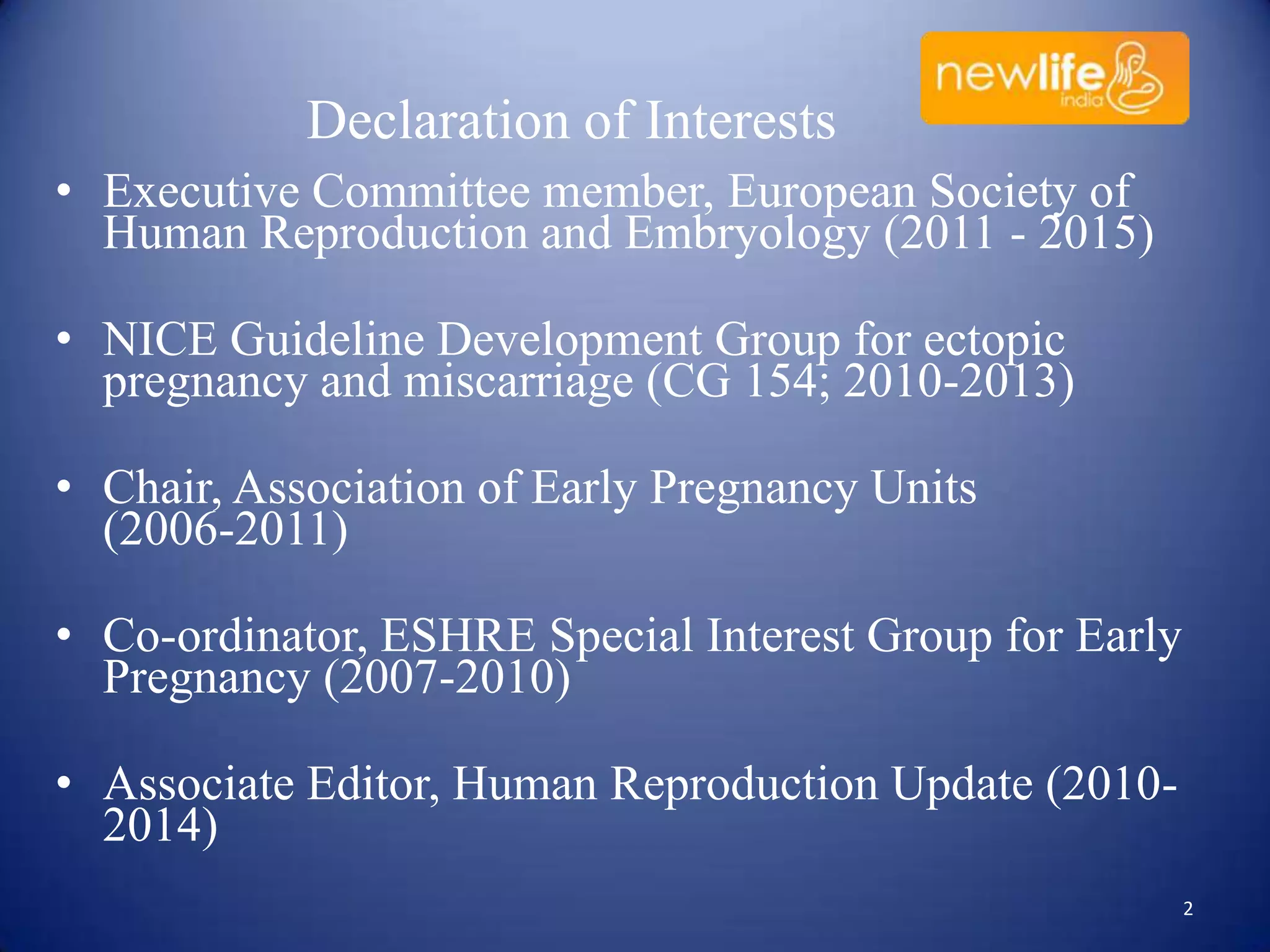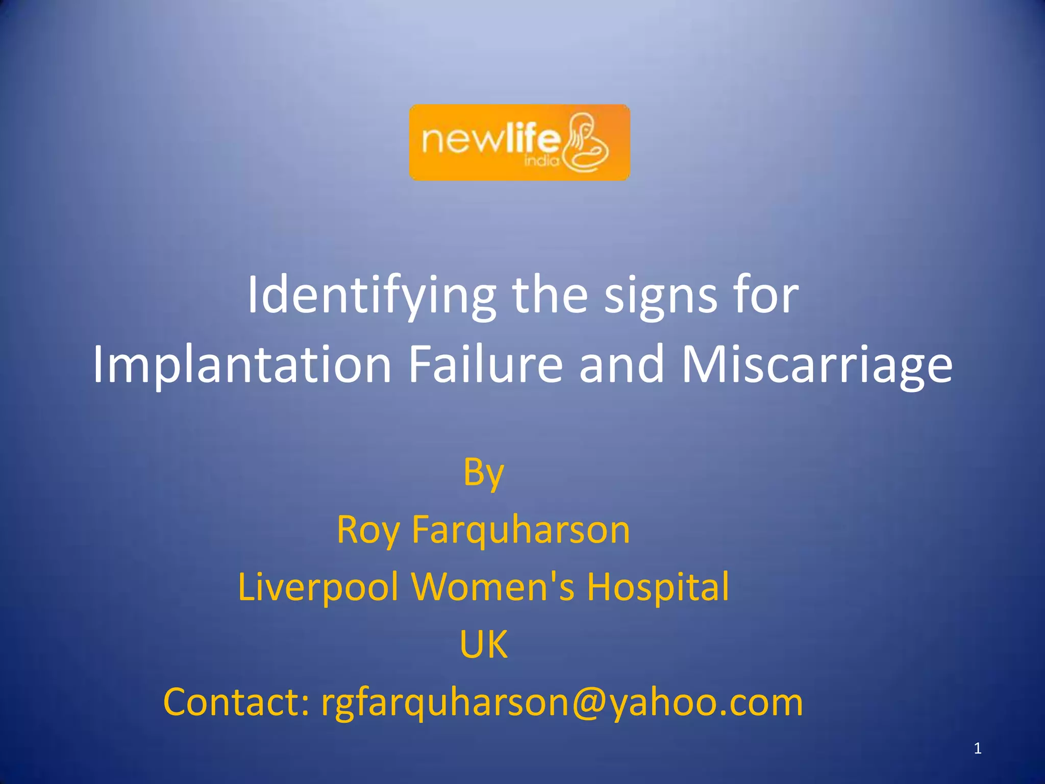 The document discusses the assessment and diagnosis of implantation failure, ectopic pregnancy, and miscarriage, highlighting limitations in current diagnostic methods and the importance of using relevant tests. It outlines various predictive modeling parameters, including the role of hormone levels such as human chorionic gonadotrophin (hcg) and progesterone in determining pregnancy outcomes. The author emphasizes the need for a practical and evidence-based approach for management while noting that a significant percentage of pregnancies of unknown location resolve spontaneously or require intervention.