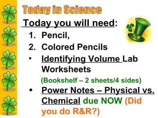 Students will need pencils, colored pencils, lab worksheets, and power notes to participate in identifying volume activities and assignments.