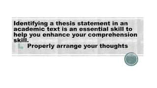 This document discusses identifying thesis statements and outlining reading texts. It begins by defining a thesis statement as a single, clear sentence that communicates the central focus or argument of a paper. It then defines academic texts as being written by experts in a specialized field using formal language. Finally, it provides guidance on identifying thesis statements within texts and outlines different outlining methods, including traditional outlines with Roman numerals and traditional outlining structures.