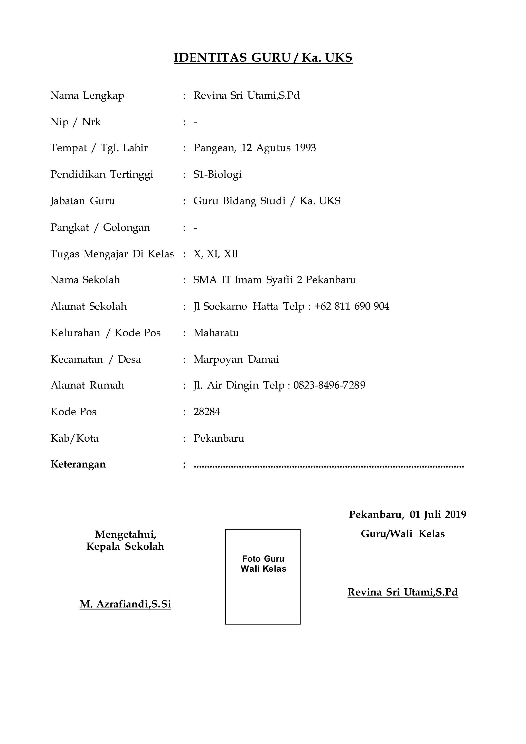 Identitas seorang guru bernama Revina Sri Utami yang berusia 28 tahun. Ia lulusan S1 Biologi dan mengajar di SMA IT Imam Syafii 2 Pekanbaru serta menjabat sebagai Kepala Unit Kesehatan Sekolah. Guru ini mengajar di kelas X, XI, dan XII serta tinggal di Jl. Air Dingin, Pekanbaru.