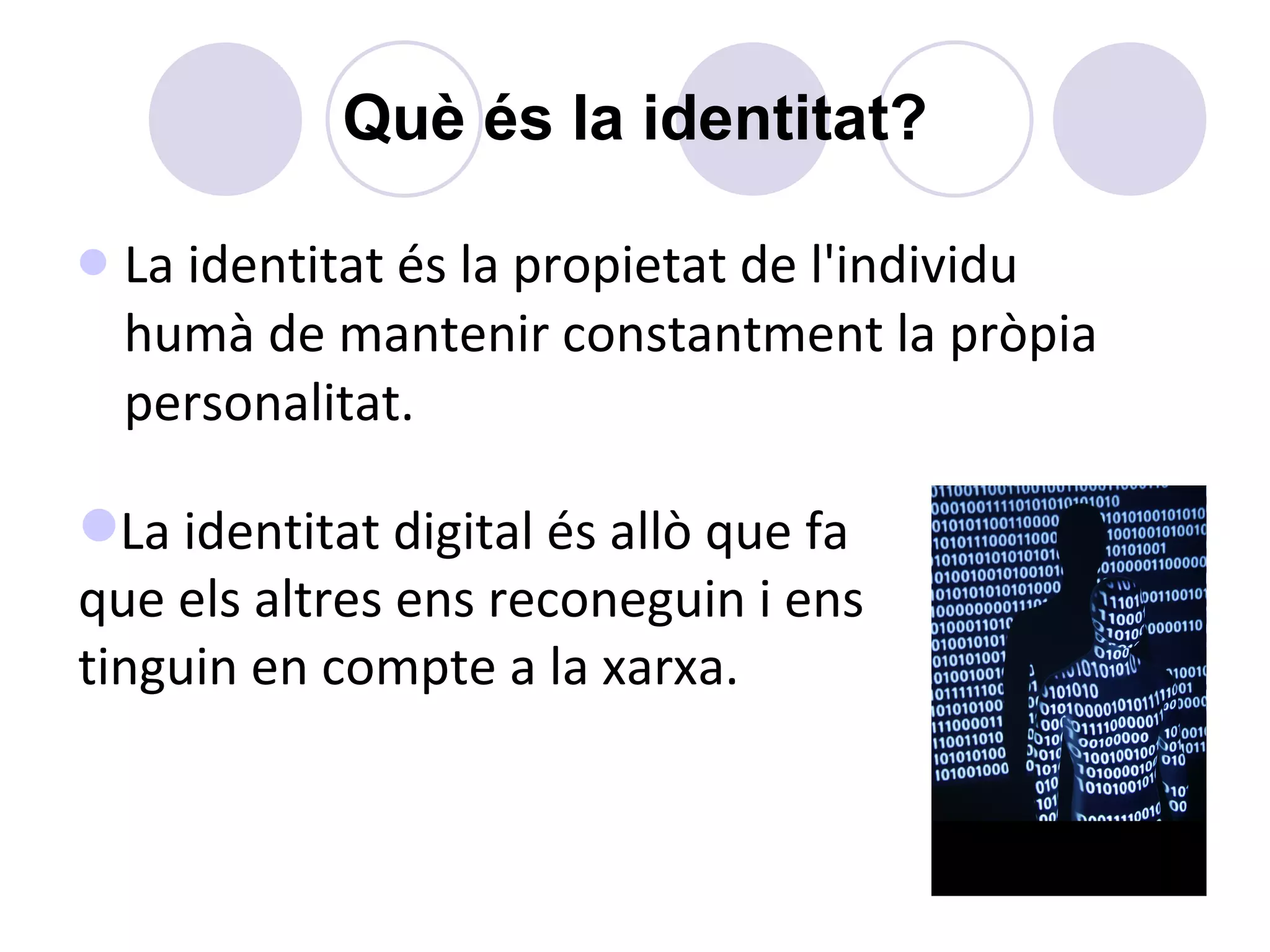 Què és laidentitat? La identitat és la propietat de l'individu humà de mantenir constantment la pròpia personalitat. La identitat digital és allò que fa que els altres ens reconeguin i ens tinguin en compte a la xarxa.
