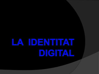 Com ens veuenels altres.IDENTITAT DIGITALConjunt de característiquesd’unindividu a la xarxaEs construieix a partir del que diem o fem en relació a la nostraidentitat, tantnosaltrescomelsdemés.TOTHOM EN DISPOSA? Tenir una identitat no implica tenir-ne una a la xarxa.Es pot triar.