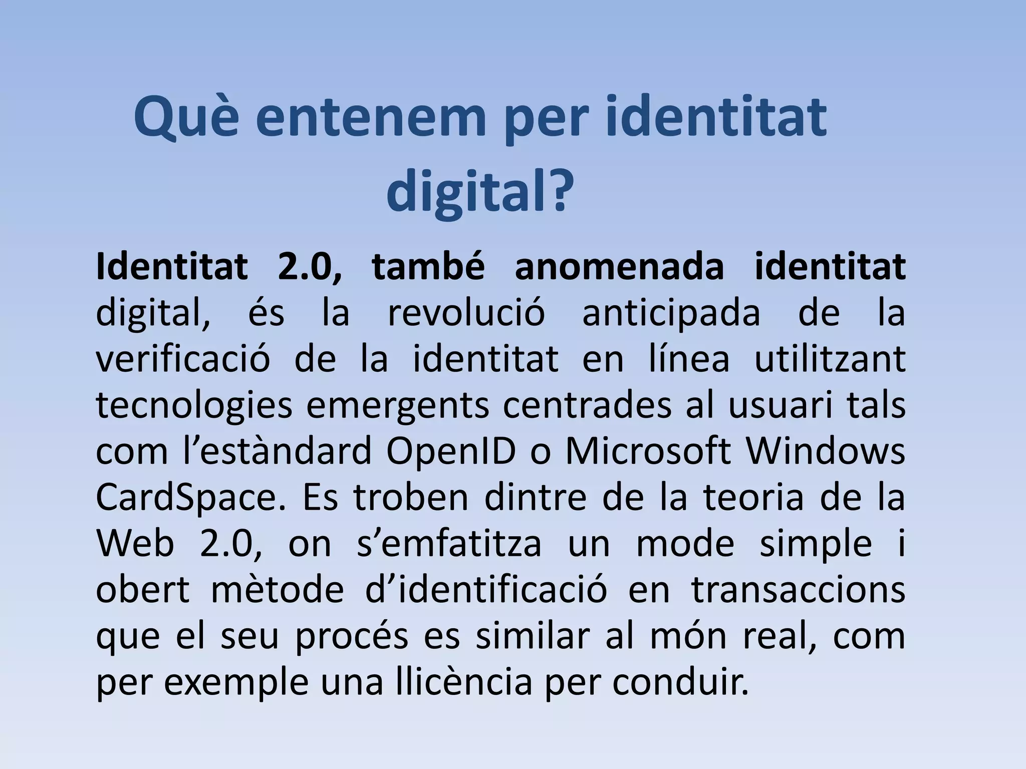 Què entenem peridentitat digital?Identitat 2.0, també anomenada identitat digital, és la revolució anticipada de la verificació de la identitat en línea utilitzant tecnologies emergents centrades al usuari tals com l’estàndard OpenID o Microsoft Windows CardSpace. Es troben dintre de la teoria de la Web 2.0, on s’emfatitza un mode simple i obert mètode d’identificació en transaccions que el seu procés es similar al món real, com per exemple una llicència per conduir.