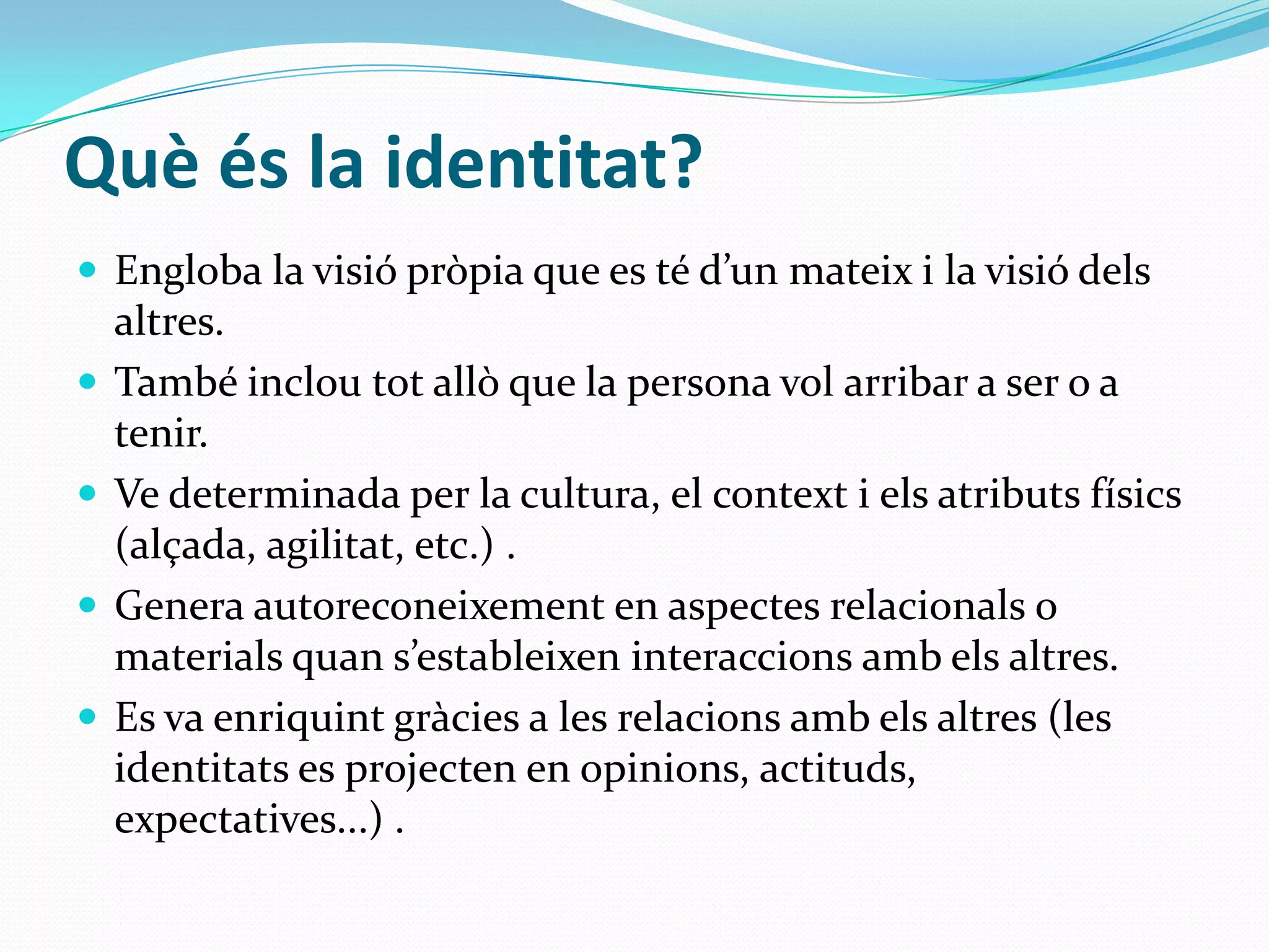 Què és laidentitat?Engloba la visió pròpia que es té d’un mateix i la visió dels altres.També inclou tot allò que la persona vol arribar a ser o a tenir.Ve determinada per la cultura, el context i els atributs físics (alçada, agilitat, etc.) .Genera autoreconeixement en aspectes relacionals o materials quan s’estableixen interaccions amb els altres.Es va enriquint gràcies a les relacions amb els altres (les identitats es projecten en opinions, actituds, expectatives...) .