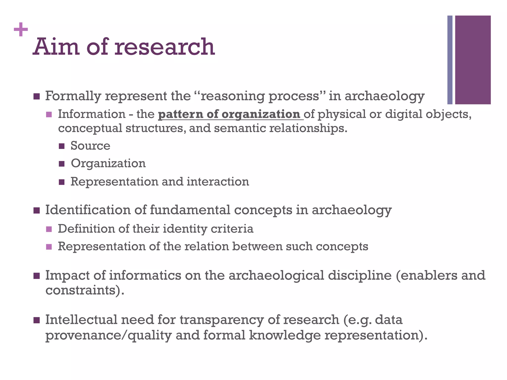 This document discusses the concept of an "archaeological site" and attempts to define its key identity criteria. It provides several common definitions of an archaeological site from literature and analyzes their core characteristics. There is no single agreed upon definition. The document then proposes a working definition and discusses some of the ongoing work needed, such as representing the actors and knowledge involved. It also gives an example of how archaeological sites are defined based on excavation boundaries and decisions. Finally, it discusses using formal ontologies like CIDOC-CRM to explicitly represent archaeological information and concepts.