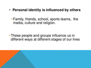 The document discusses identity formation in adolescents. It states that identity formation is influenced by the relationship between parents and adolescents, with positive relationships allowing more freedom to explore identity options. Specifically, parental involvement in support, social monitoring and school monitoring positively influences identity formation for both boys and girls. The type of relationship adolescents have with their parents plays a significant role in identity formation. The internet also influences identity formation, as it allows youth to express themselves, try out different profiles, negotiate their identity, and test acceptance from others online.