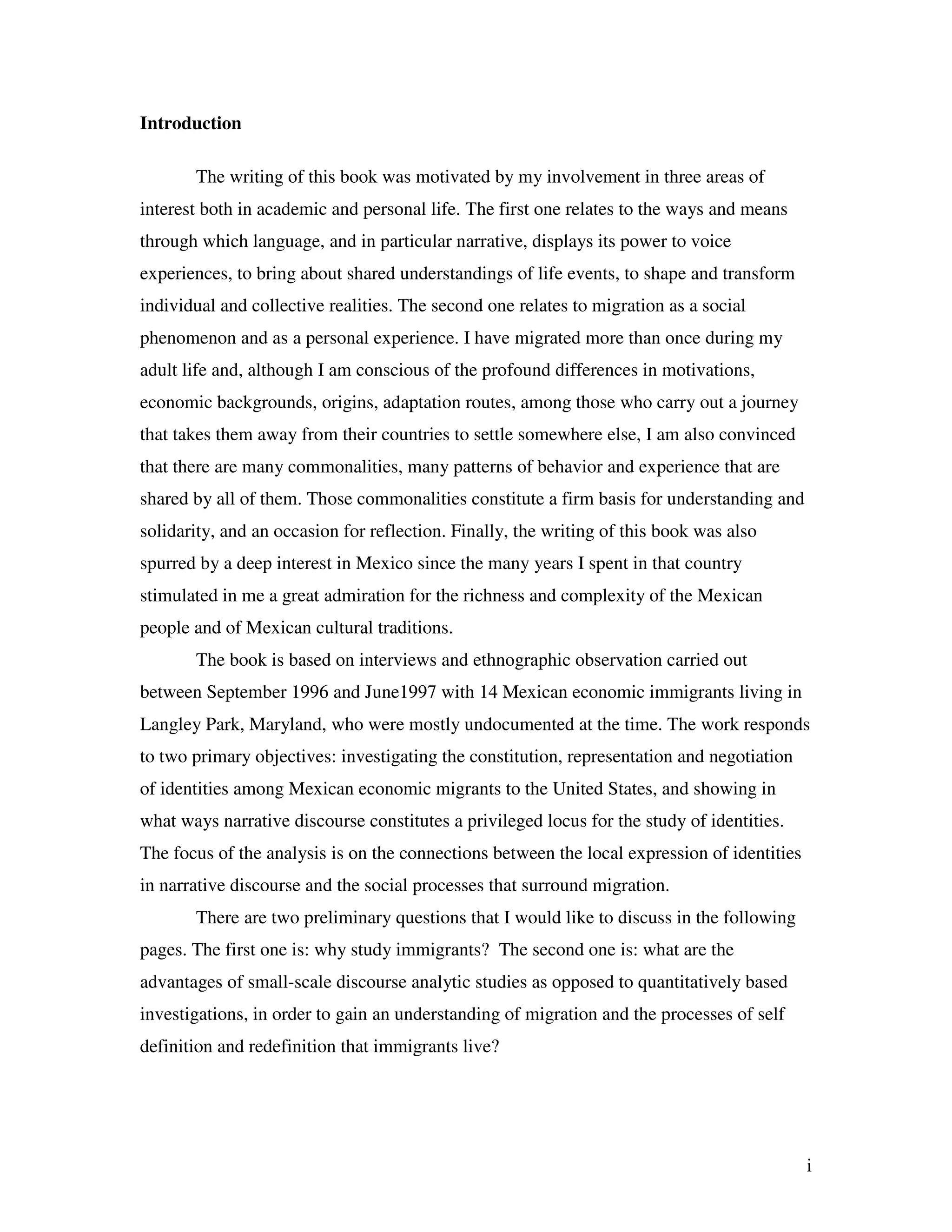 This document introduces the motivation and objectives of the book. It aims to investigate the construction and negotiation of identities among Mexican immigrants in the United States through qualitative analysis of narratives. Specifically, it seeks to understand how narrative discourse shapes identities and how identities are expressed locally in narratives. The book is based on interviews with 14 Mexican immigrants in Maryland. It argues that qualitative, discourse-based approaches provide valuable insights into immigrant experiences and identities that are often overlooked. Narratives in particular are well-suited for this analysis as they allow immigrants to freely discuss their experiences and negotiate meanings and identities.
