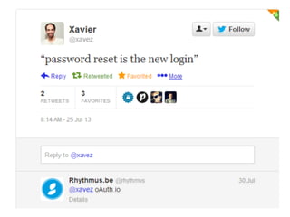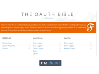 The document discusses the challenges of authentication and identity management through passwords and the emergence of single sign-on (SSO) solutions to enhance user experience and security. It explores the evolution of OAuth protocols, highlighting the differences between OAuth 1.0 and 2.0, and the importance of identity providers in granting access to user resources without sharing credentials. The author emphasizes the need for better user experience and security in authorization processes, while noting the fragmentation and limitations within current OAuth implementations.