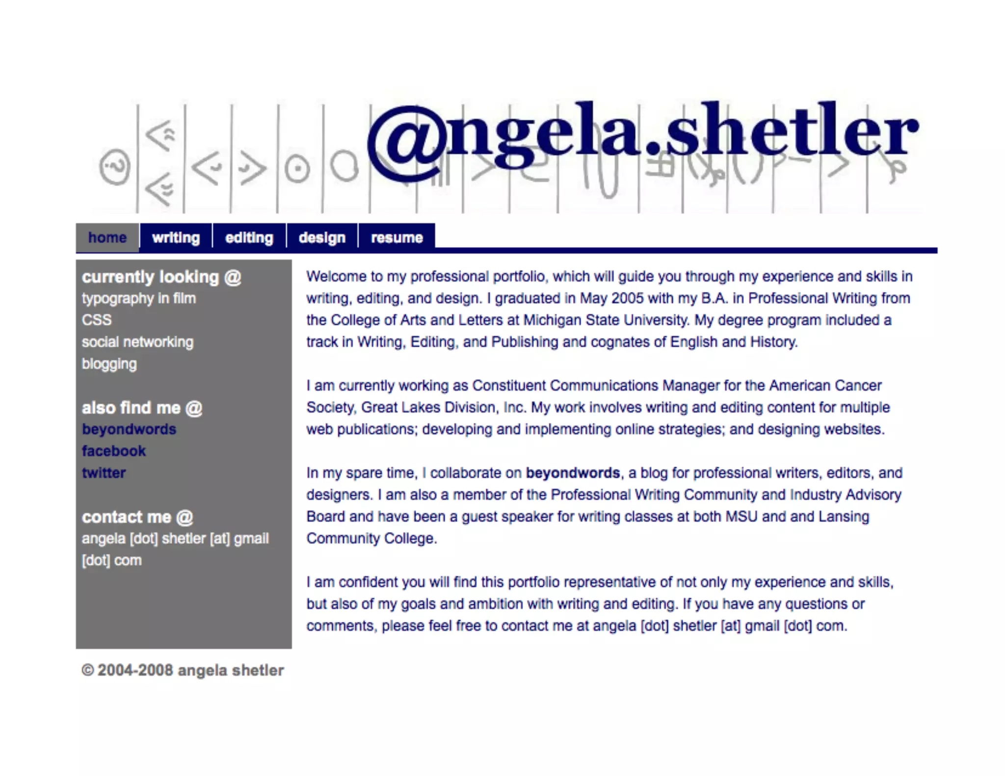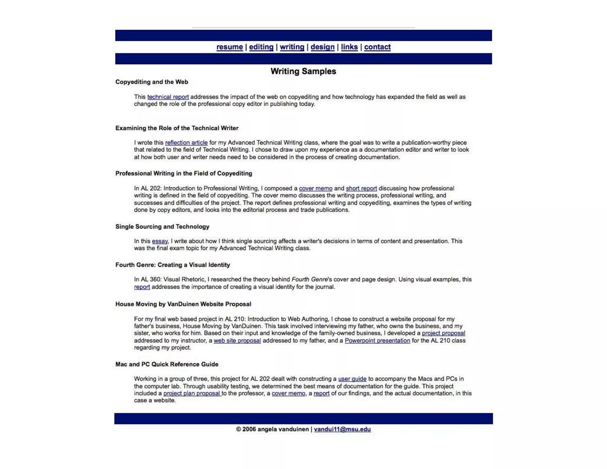 This document discusses negotiating identity in the digital space as a professional writer and communicator through rhetoric and writing. It provides an overview of the evolution of the author's online portfolio from its launch in 2004 through various redesigns and updates, as they transitioned from a student to professional engaging with professors, classmates, employers, and clients. Their identity is presented as performative, curative, and authored online through their digital portfolio.
