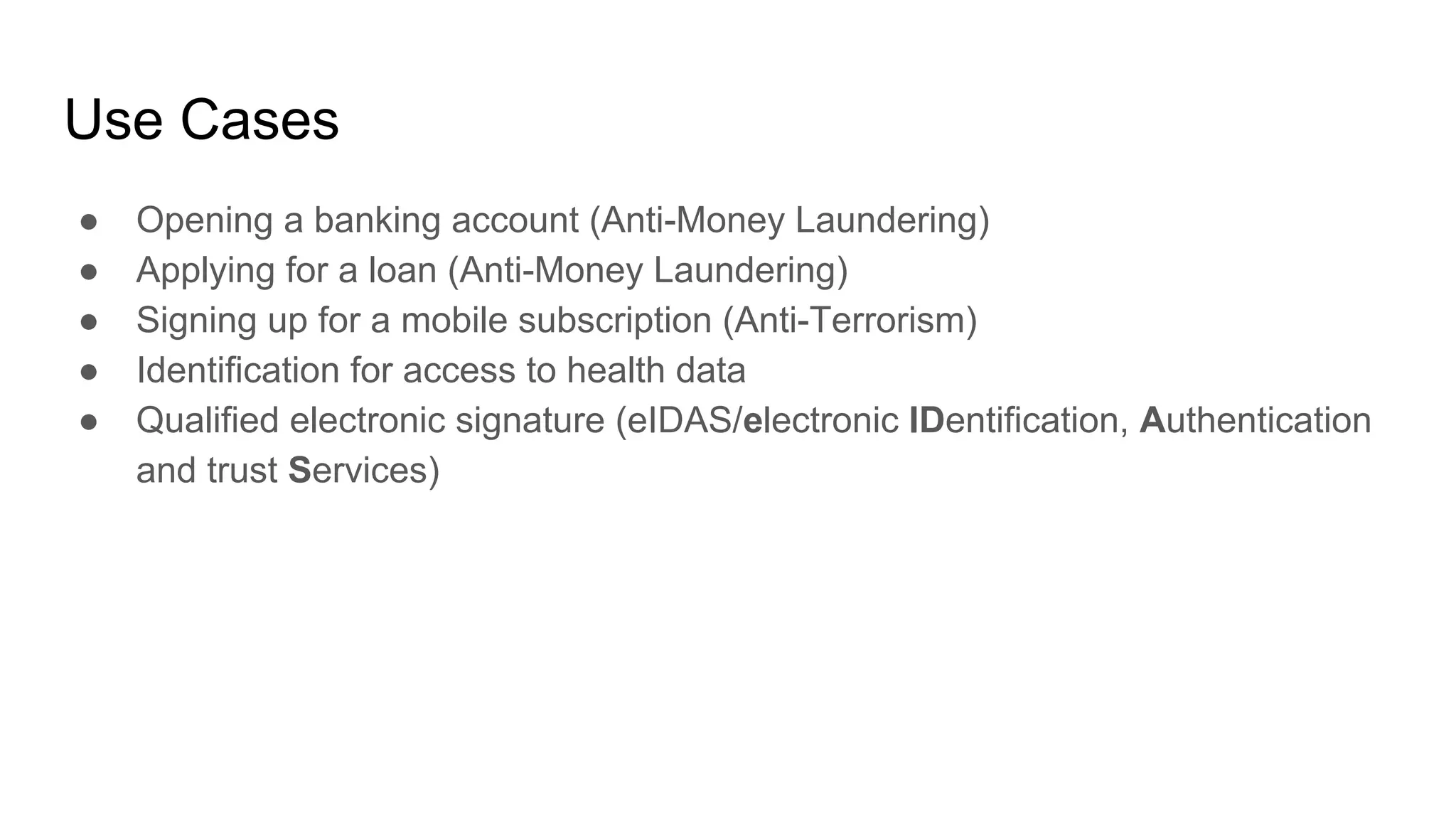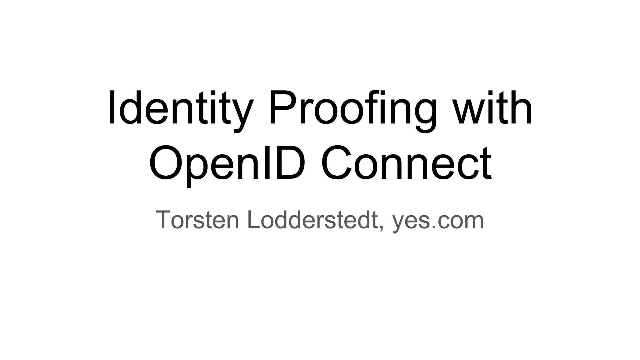 The document discusses identity proofing using OpenID Connect. It provides examples of use cases that require identity verification like opening a bank account or accessing health data. It proposes representing verified identity claims in a composite JSON Web Token claim that includes metadata about the verification process and the verified claims. An example token is given that verifies a user's name, date of birth, place of birth and nationality according to a specified assurance level by referencing an existing bank verification. The document also describes how to request specific verified claims from the identity provider.