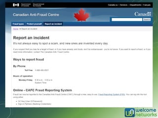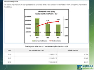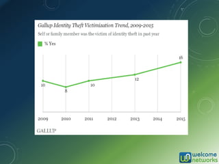 The document discusses the increasing risk of identity theft and how to prevent it, highlighting key statistics and common scenarios. It emphasizes the importance of vigilance and various protective measures, such as securing personal information and utilizing technology safely. The document also outlines the steps to take if one becomes a victim of identity theft, including notifying credit agencies and law enforcement.