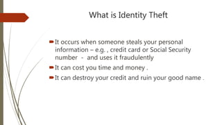 Identity theft occurs when someone steals personal information like credit card or Social Security numbers and uses them fraudulently. Thieves can commit credit card fraud, open phone and utility accounts, take loans, or file fraudulent tax returns using a victim's identity. Victims can face financial costs and damaged credit. Key techniques used by thieves include dumpster diving, skimming, phishing, and social engineering. To protect yourself, shred documents with personal information, use strong passwords and updates, enable security software, monitor accounts, and file a police report if identity theft occurs.