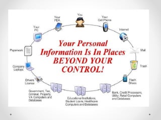 Identity theft occurs when someone steals personal information like names, addresses, birth dates, social security numbers, etc. and uses it to impersonate the victim. This can be used to open credit cards and bank accounts, take loans, get medical treatment, and more all in the victim's name. Victims can face damaged credit, financial losses, and spend significant time repairing their credit and good name. Common ways identity thieves get information include dumpster diving, phishing emails/calls, hacking computers and networks, and data breaches at companies. Laws like the Identity Theft and Assumption Deterrence Act and the Information Technology Act in India make identity theft a crime and provide punishments. Victims should monitor accounts,