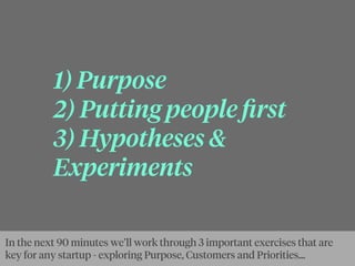 The document outlines a workshop focused on three key exercises critical for startup success: defining purpose, understanding customers, and prioritizing experiments. It emphasizes the importance of a startup's purpose as a guiding light that motivates decision-making, the necessity of truly empathizing with customers, and the scientific method for validating business hypotheses. The workshop encourages participants to engage in real-world observation and experimentation rather than relying solely on traditional metrics of progress.