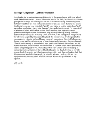 John Locke's view of human nature most closely aligns with the author's view that humans are neither inherently good nor evil at birth. The author believes that upbringing and environment shape whether a person develops good or evil habits, not some innate quality. For example, a person raised in a crime-ridden, low-income family would likely learn evil habits, while the same person adopted by royalty would develop good etiquette. Overall, the author argues that human nature is defined by capacity for reason and empathy, not an inborn moral orientation, so it is inaccurate to categorize all humans as universally good or evil.