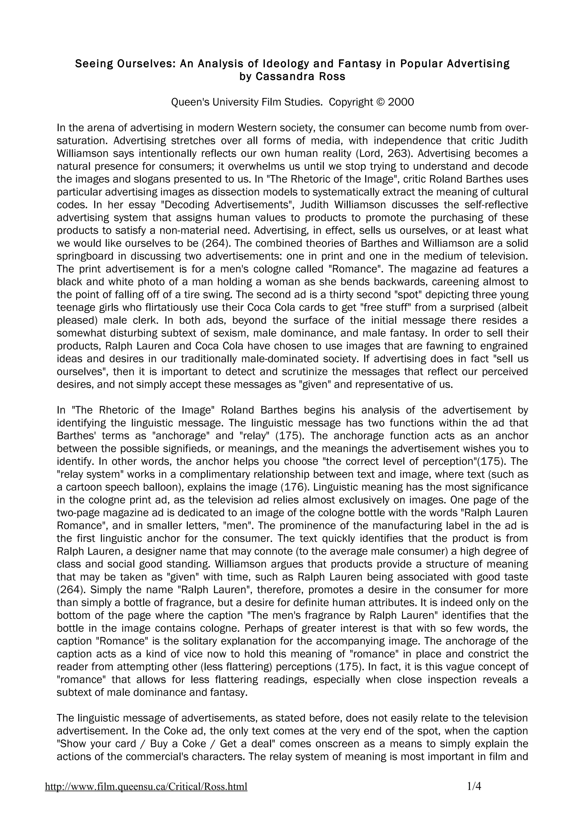 This document analyzes and summarizes an essay by Cassandra Ross that examines how ideology and fantasy are portrayed in popular advertising. It discusses Roland Barthes' theory of linguistic and denotative/connotative meanings in advertisements. It analyzes two specific ads - a print ad for Ralph Lauren cologne and a TV ad for Coca-Cola. Both ads are found to portray a subtext of sexism, male dominance and male fantasy through their imagery. The placement of the ads in magazines and TV programming aimed at men and youth further informs the meanings and messages being conveyed.