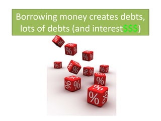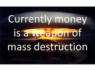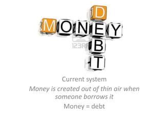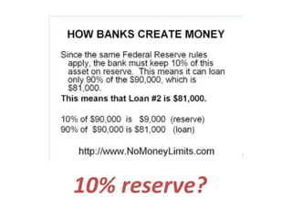The document discusses issues with the current monetary system where money is created through borrowing from banks. It notes that when banks keep only 10% of deposits as reserves while lending out the other 90%, this creates a fragile system vulnerable to bank runs if too many depositors try to withdraw their money at once. It suggests the current system amounts to using money as a weapon of mass destruction, given the immense debts and interest it has created globally. The document calls for a serious debate on reforms to the monetary system.