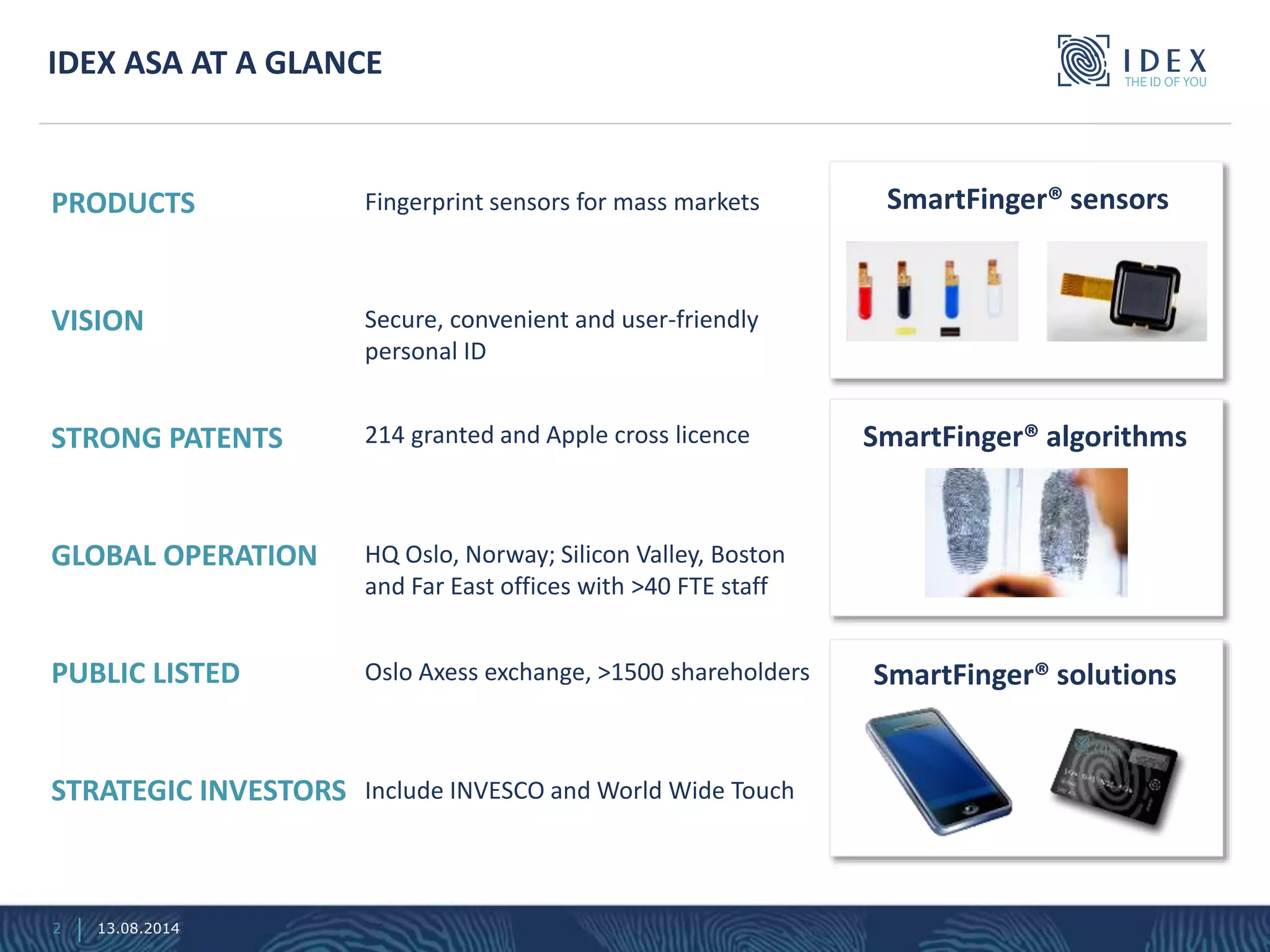 IDEX ASA is focused on enabling the mass market for secure identification through their proprietary smartfinger® technology, which includes fingerprint sensors and solutions catering to growing mobile adoption and payment trends. The company boasts a strong patent portfolio and strategic partnerships, positioning itself as a competitor in the billion-unit market. With anticipated product launches and increasing customer interest, IDEX aims to capitalize on the rapidly evolving biometric technology landscape.