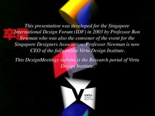 The document presents a presentation by Professor Ron Newman at the 2003 Singapore International Design Forum, discussing the importance of creative industries in design education. It highlights the significant economic contributions of creative sectors, their rapid growth, and the necessity for educational institutions to adapt to new business models that integrate creativity with commerce. Additionally, Newman emphasizes the need for Singapore to develop unique strategies for its creative industries rather than merely replicating external ideas.