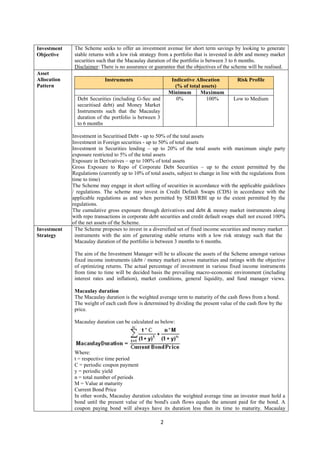 2. The fund seeks to generate stable returns with low risk by investing in debt and money market instruments such that the portfolio's Macaulay duration is between 3 to 6 months.