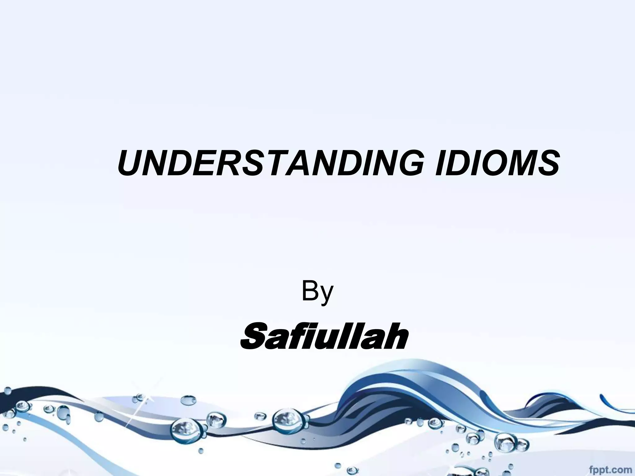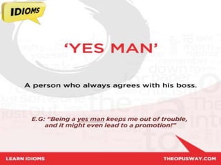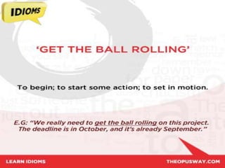 The document discusses idioms, which are expressions with meanings that cannot be determined from the individual words. It provides examples of common idioms like "raining cats and dogs" and "get another bite of the cherry." Additional idioms explained include "chase your tail," "get the show on the road," and "dead wood." Each idiom's literal meaning is given alongside its actual figurative meaning and examples of usage.