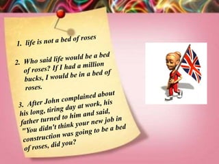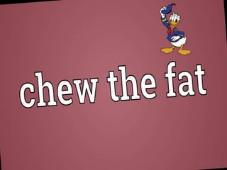 This document discusses two English idioms: "take the easy option" which refers to choosing a comfortable or luxurious position, and "chew the fat" which refers to having a long, friendly chat or gossip with someone.