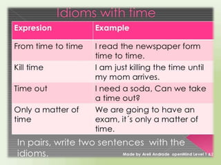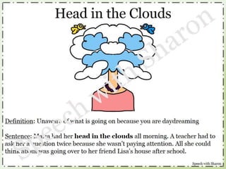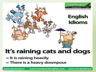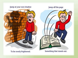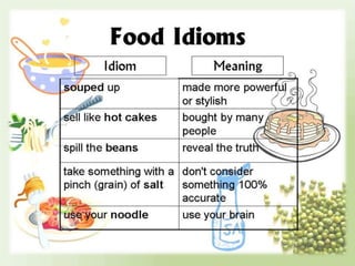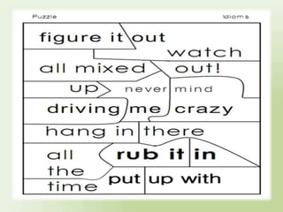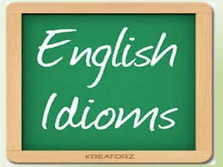 Every culture has idioms or phrases that do not make literal sense but are understood. Most idioms originate from ancient literature or classic films, with many coming from Shakespeare's writings. Idioms enrich language and increase vocabulary, but their grammar and wording must remain fixed or their meanings will be lost. Idioms can be fun to use in writing as a form of imagery to describe attitudes, behaviors, or draw attention to important points.