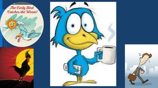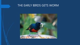 The document discusses two common sayings - "the early bird gets the worm" meaning that being early allows one to be successful by getting the best seats. It also discusses "out of sight, out of mind" which emphasizes that it is easy to forget something or someone that you cannot see. An example is given of forgetting an ex-friend by not looking at anything that reminds you of them.