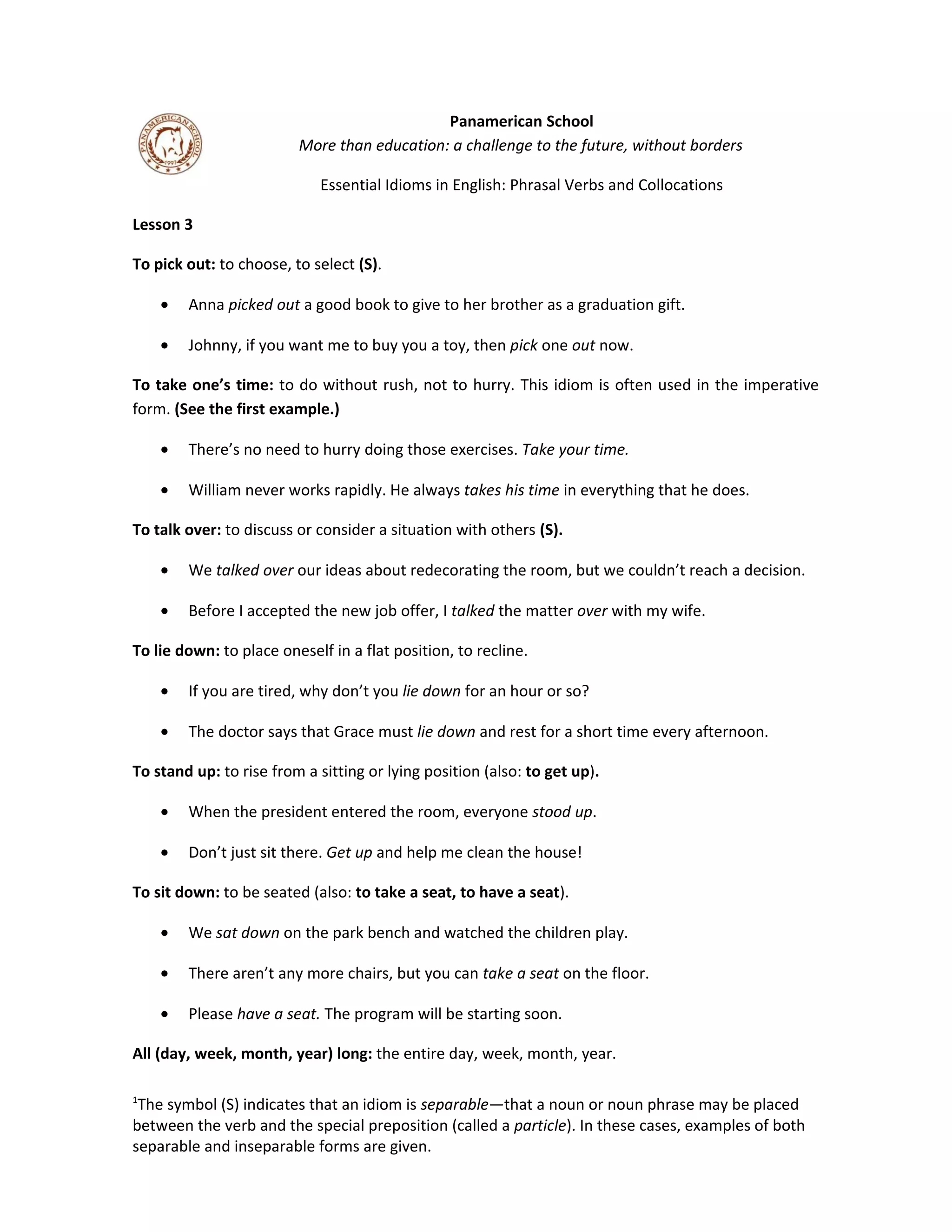 This document provides a lesson on common English phrasal verbs and collocations. It defines 12 idiomatic phrases, including "to pick out," "to take one's time," and "to talk over." Each definition is accompanied by an example sentence to illustrate usage. The lesson concludes with exercises for learners to practice using the new idioms by filling in blanks or choosing the appropriate phrase for given sentences.