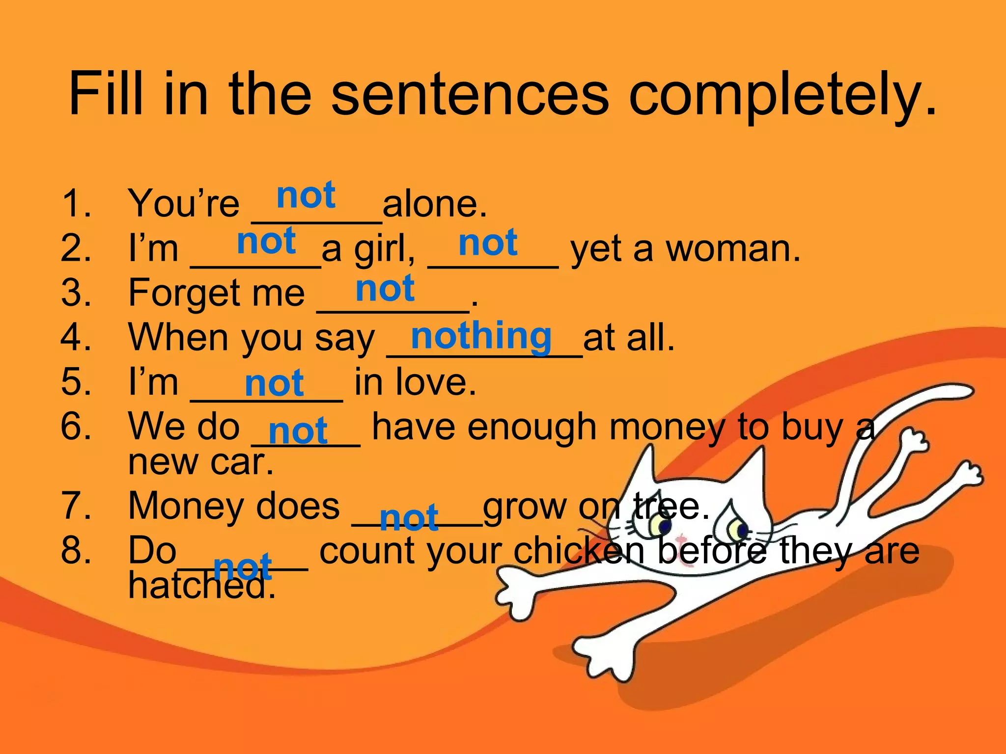 Fill in thesentences completely. You’re ______alone. I’m ______a girl, ______ yet a woman. Forget me _______. When you say _________at all. I’m _______ in love. We do _____ have enough money to buy a new car. Money does ______grow on tree. Do______ count your chicken before they are hatched. not not not not nothing not not not not
