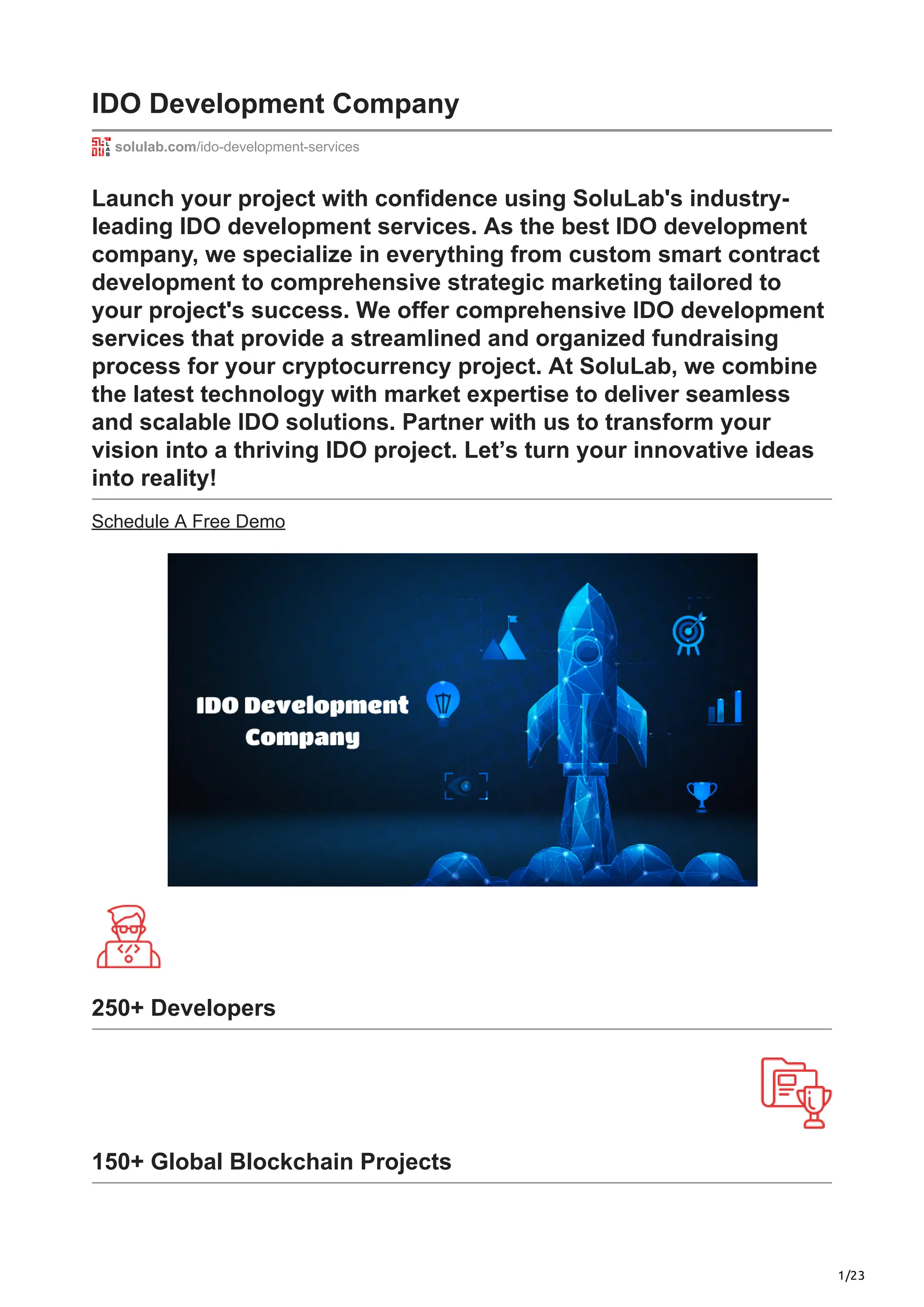 Solulab offers comprehensive IDO development services, specializing in custom smart contract creation, fundraising management, and strategic marketing to ensure successful token launches for cryptocurrency projects. With over 10 years of experience and a team of 250+ developers, they cater to various industries including finance, healthcare, and education, providing tailored solutions that include token creation, community building, and post-launch support. Their platform emphasizes transparency, efficiency, and scalability, enabling clients to effectively reach their fundraising goals through decentralized fundraising models.