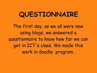 1) The document summarizes the works completed by students in their ICT class over the first term, including creating contact groups, personal blogs, articles on various topics, collaborative stories, and a school timetable.