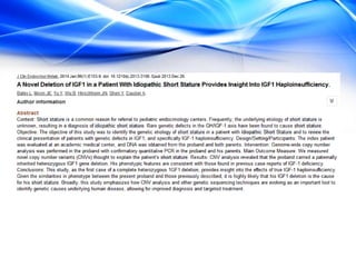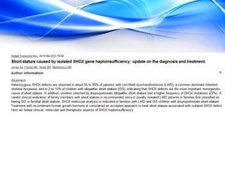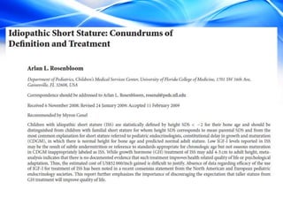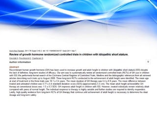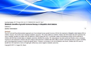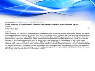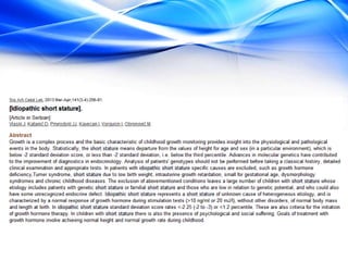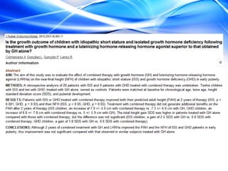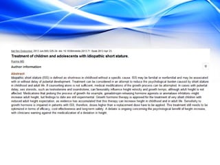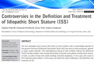 The document discusses the treatment of idiopathic short stature (ISS) in children. It defines ISS as height more than 2 standard deviations below the mean without an identifiable medical cause. Growth hormone treatment can increase growth velocity and adult height but results are modest. Treatment requires consideration of psychosocial factors and risks. The optimal dosing of growth hormone for ISS is 25-50 mcg/kg/day. Other potential treatments mentioned include IGF-1, GnRH analogs, testosterone, and aromatase inhibitors but long-term safety and efficacy are not well established.