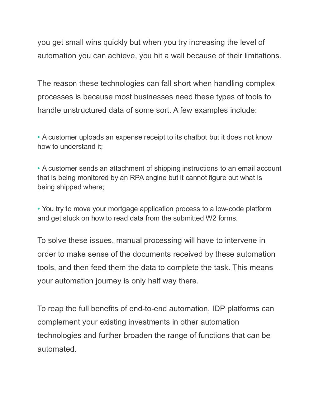 The reason these technologies can fall short when handling complex processes is that most businesses need these types of tools to handle unstructured data of some sort. A few examples include: