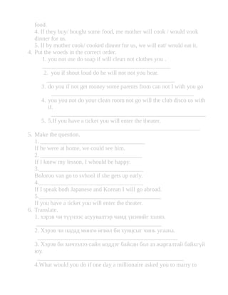 The document provides examples and exercises to practice using conditionals in English. It focuses on the first conditional (if + present, will/can/may + bare infinitive) and second conditional (if + past, would + bare infinitive). There are multiple choice, fill in the blank, word order, and translation exercises involving conditional sentences.
