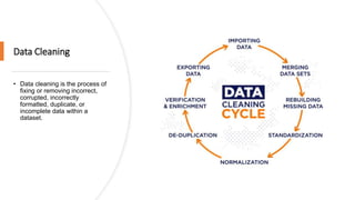 The document discusses key concepts in data science including data cleaning, integration, reduction, transformation, and discretization. It defines each concept and provides examples. Data cleaning involves fixing incorrect, incomplete, or duplicate data. Data integration combines data from different sources. Data reduction decreases storage needs by reducing data capacity. Data transformation converts data between formats. Discretization buckets continuous values into a limited number of states.