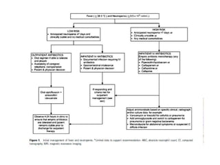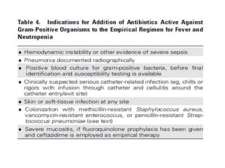 3. The guidelines make recommendations on appropriate empiric antibiotic therapy, modifying treatment, treatment duration, and use of prophylaxis for both high-risk and low-risk neutropenic fever patients. It also provides guidance on use of empirical and preempt