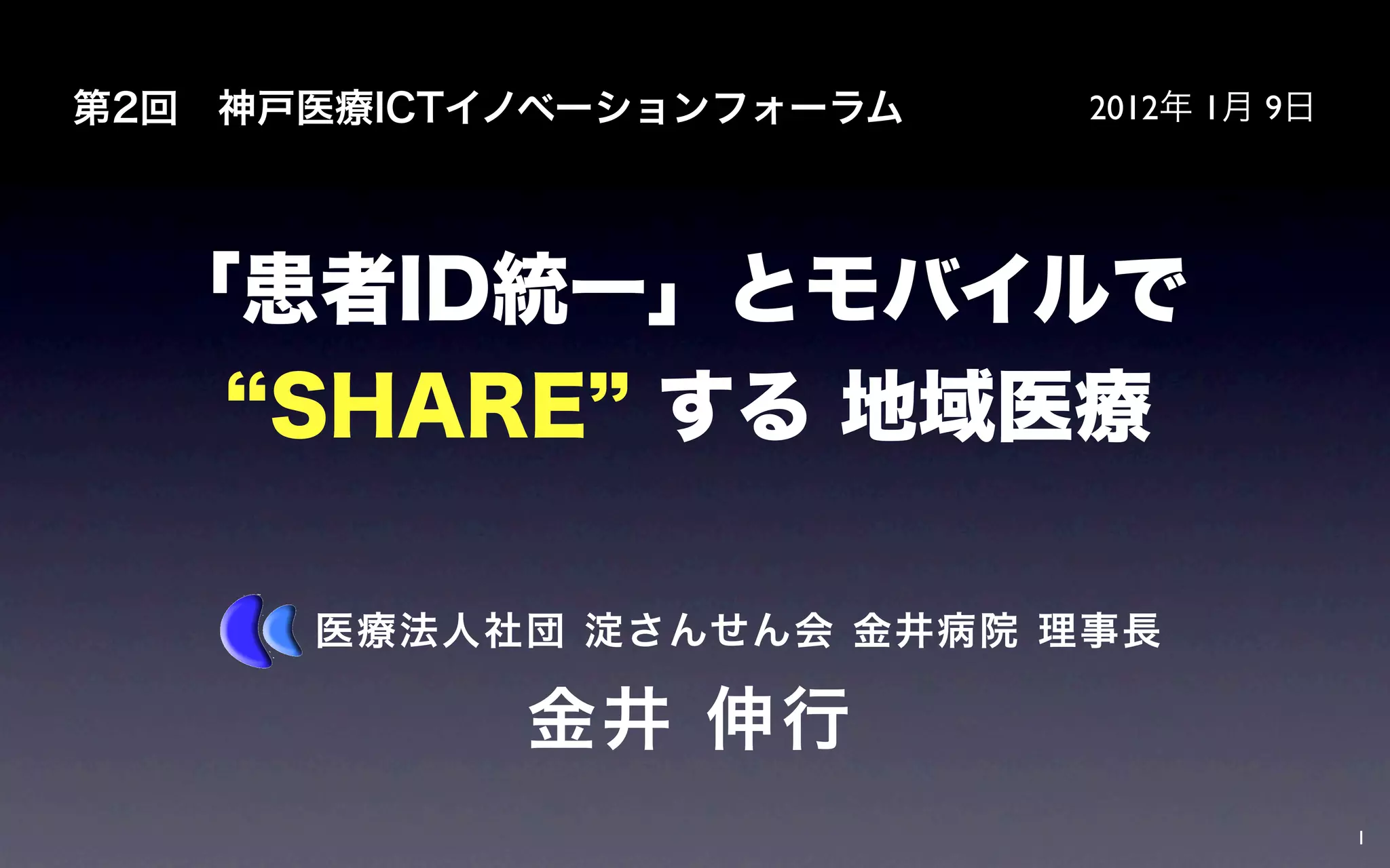 2012年 1月 9日 「患者ID統一」とモバイルで SHARE する 地域医療 医療法人社団 淀さんせん会 金井病院 理事長 金井 伸行 1