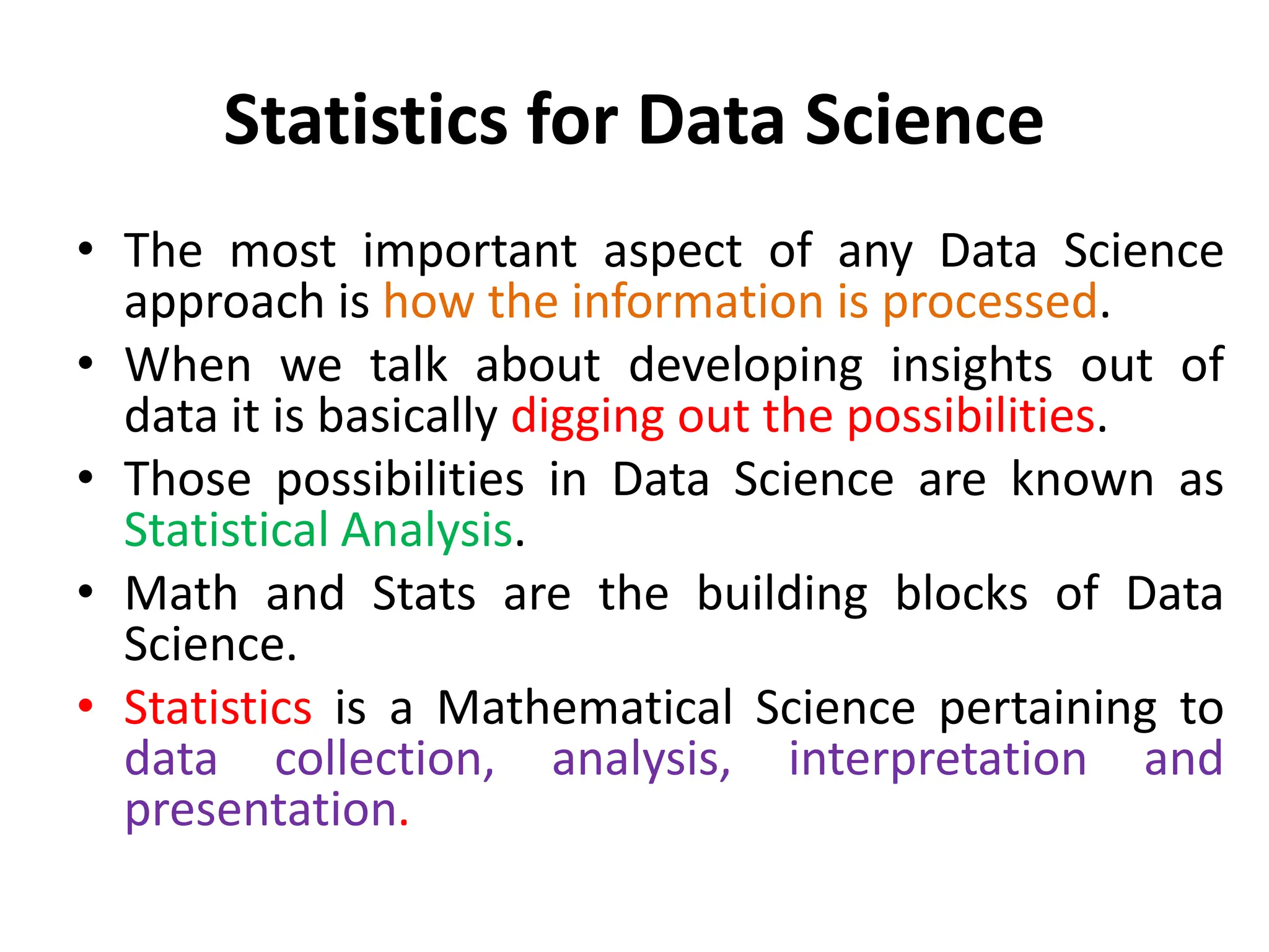 This document provides an introduction to statistics for data science. It discusses why statistics are important for processing and analyzing data to find meaningful trends and insights. Descriptive statistics are used to summarize data through measures like mean, median, and mode for central tendency, and range, variance, and standard deviation for variability. Inferential statistics make inferences about populations based on samples through hypothesis testing and other techniques like t-tests and regression. The document outlines the basic terminology, types, and steps of statistical analysis for data science.