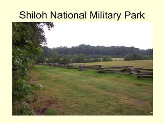 Shiloh National Military Park commemorates the Battle of Shiloh, fought April 6-7, 1862 in Tennessee between Confederate and Union forces. The battle began as a surprise Confederate attack on encamped Union troops, who were pushed back initially but reinforced by nightfall. Heavy losses were suffered by both sides over the two days of fighting, with the Union mounting a counter-offensive and driving the Confederates from the field on the second day. Historical markers and monuments help visitors understand the locations and events of this pivotal Civil War battle.
