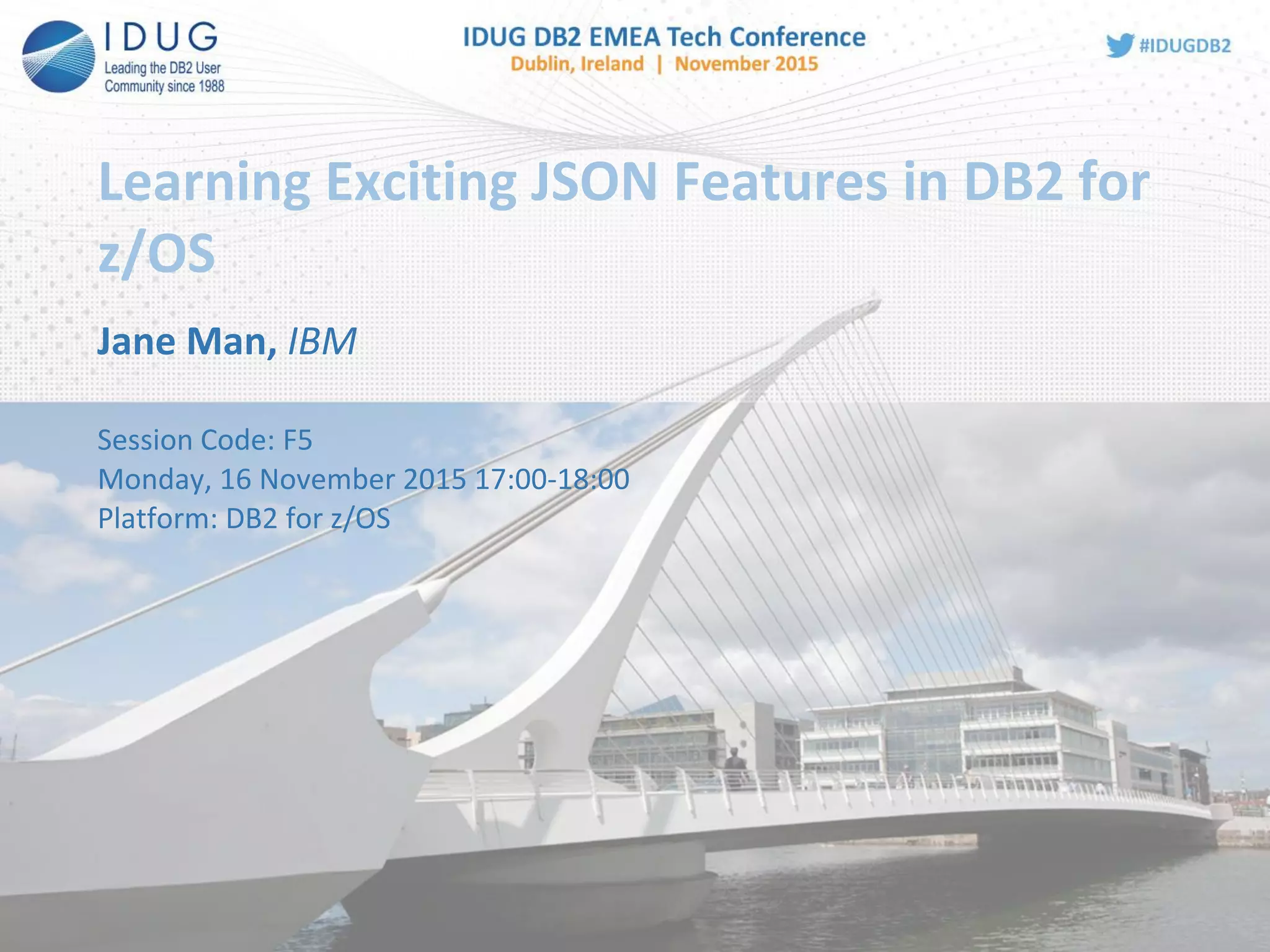 The document presents a session from IBM discussing the JSON storage model and SQL APIs in DB2 for z/OS. It emphasizes the integration of JSON with enterprise data to enhance agility and efficiency in application development while outlining key features and examples of JSON functionalities, including conversion functions and built-in features for JSON data extraction. The session addresses the motivations for NoSQL in enterprise environments and provides a comprehensive agenda detailing various aspects of JSON technology in DB2.