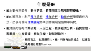 本文介绍了工业工程(IE)的基本概念和技术,包括动作研究、时间测定和现场管理优化等。IE的目标是通过有效的人员、机器和材料组合,实现优化的生产效率,文中提出了诸多改善方法和步骤,如5W1H手法、人机程序图等,并分析了工作流程的简化和减少浪费的重要性。最后,文中强调了系统性改善步骤在提升生产力和减少成本中的重要作用。