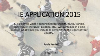 The document discusses what cultural artifacts from Croatia would be included in a time capsule to represent the country's legacy. It summarizes several important aspects of Croatian cultural heritage that could be included: